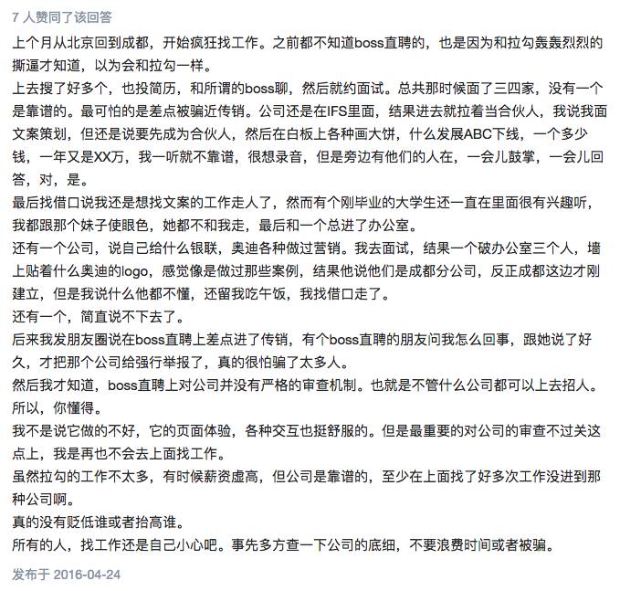 早在2016年就有许多帖子爆出Boss直聘职位是假的,随手上知乎上搜一下就能发现不少: